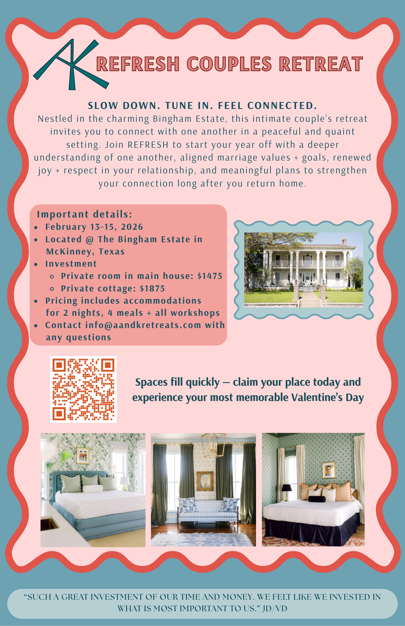 Nestled in the charming Bingham Estate, this intimate couples retreat invites you to connect with one another in a peaceful and quaint setting. Join REFRESH to start your year off with a deeper understanding of one another, aligned marriage values + goals, renewed joy + respect in your relationship, and meaningful plans to strengthen your connection long after you return home. This historic estate has 6 cottages with king beds as well as 4 bedrooms (2 king rooms and 2 rooms with 2 twins) in the original home on property. All cottages have private bathrooms, coffee maker and mini fridge. Each room in the main home has a private bathroom and there is a full kitchen, dining and parlor as well.