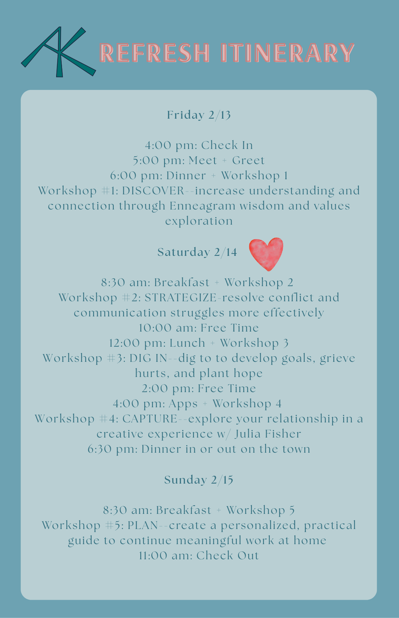 A+K Retreats put on a fantastic weekend retreat. Every detail was thoughtful and well curated. I enjoyed learning in the workshops AND having time to myself each day. It was the perfect self care balance. I can’t wait for the next retreat!